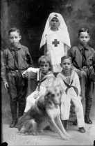This was father's idea. The twins had joined the boy scouts. This was in Ponce, Puerto Rico. And he figured out it would make a nice picture to have them with their uniform to represent the army, Italo and Marco wearing their navy suits, and myself representing the red cross. Also in the picture appears our very nice and loving dog. His name was Dinki, and he was a collie. The twins were so identical, it was hard to tell one from the other. But if I recall well, the one standing on the left is Remo, and the one standing on the right is Romolo. Of the two sitting, the one sitting on the left is Marcos, and the one sitting on the right is Italo. |